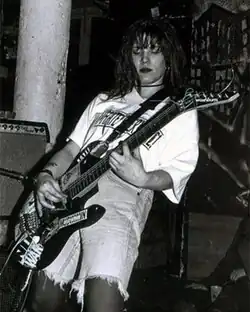 After leaving high school, Sargent worked various jobs and traveled across the West Coast.[1] She was a member of several bands, including Barbie's Dream Car.[4] In 1990, she co-founded 7 Year Bitch alongside Selene Vigil, Valerie Agnew and Elizabeth Davis.[1] The band made their debut opening for The Gits then played at a Books for Prisoners Benefit concert.[4] Sargent played guitar on the band's debut record, Sick 'Em (1992).[1][5]