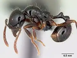The species have black legs and a dorsal face which have a transverse rugae. It propodeum is identical in brightness to promesonotum.[1]