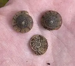 Mature Stenotrema barbigerum (upper left), Stenotrema spinosum (upper right), and Anguispira cumberlandiana (bottom) individuals found together on a limestone boulder