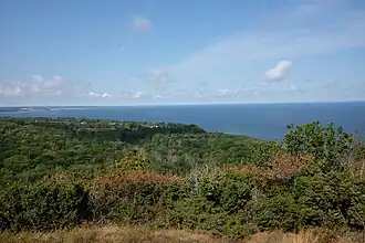 The hill is 97 m (318 ft) high and faces the Baltic Sea.[2] Since the surrounding landscape is relatively flat, it can be seen from a great distance and has traditionally been used as a landmark for seafarers. Many visitors trek up the hill to enjoy the view which is very good in clear weather. The Stenshuvud National Park is traversed by a section of the Skåneleden Trail, between Simrishamn and Kivik. The trail ascends Stenshuvud, offering a diverse range of landscapes and views.[2]