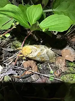 The wingspan is 66–100 mm. There are two color forms, a purple-grey and a yellow-brown form. The hindwings are purple brown or salmon pink and generally unmarked.[2]
