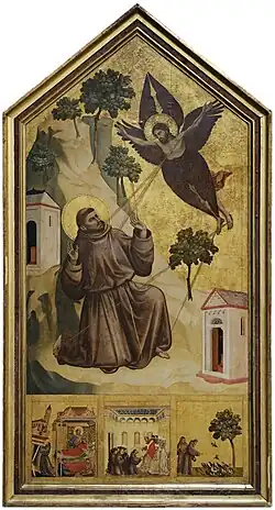 Saint Francis Receiving the Stigmata is a panel painting in tempera by the Italian artist Giotto, painted around 1295–1300 for the Church of Saint Francis in Pisa and it is now in the Musée du Louvre in Paris. It shows an episode from the life of Saint Francis of Assisi, and is 314 cm high (to the top of the triangule) by 162 cm wide. It is signed OPUS IOCTI FLORENTINI ("Work of Florentine Giotto").