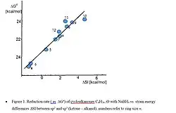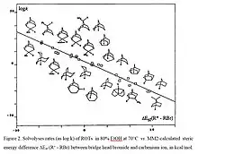 According to the VSEPR theory of molecular bonding, the preferred geometry of a molecule is that in which both bonding and non-bonding electrons are as far apart as possible. In molecules, it is quite common for these angles to be somewhat compressed or expanded compared to their optimal value. This strain is referred to as angle strain, or Baeyer strain.[9] The simplest examples of angle strain are small cycloalkanes such as cyclopropane and cyclobutane, which are discussed below. Furthermore, there is often eclipsing or Pitzer strain in cyclic systems. These and possible transannular interactions were summarized early by H.C. Brown as internal strain, or I-Strain.[10] Molecular mechanics or force field approaches allow to calculate such strain contributions, which then can be correlated e.g. with reaction rates or equilibria. Many reactions of alicyclic compounds, including equilibria, redox and solvolysis reactions, which all are characterized by transition between sp2 and sp3 state at the reaction center, correlate with corresponding strain energy differences SI (sp2 -sp3).[11] The data reflect mainly the unfavourable vicinal angles in medium rings, as illustrated by the severe increase of ketone reduction rates with increasing SI (Figure 1). Another example is the solvolysis of bridgehead tosylates with steric energy differences between corresponding bromide derivatives (sp3) and the carbenium ion as sp2- model for the transition state.[12] (Figure 2)