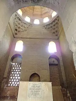 Between the two domes and tomb chambers is a large iwan (vaulted hall open to one side), with an inscription running along its walls. This iwan has a stone mihrab (niche symbolizing the direction of prayer) whose upper section is carved with muqarnas in a style similar to the lateral niches in the entrance portal of the Madrasa-Mosque of Sultan Hasan, possibly of Anatolian (Turkish) inspiration.[1] This iwan was probably used for prayers and most likely faced a large courtyard which was adjoined to the mausoleum structure.[1]