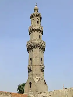Nearby, presumably at the opposing end of the vanished courtyard, rises the mausoleum's minaret, which now appears to stand alone but originally would have been connected to the mausoleum by the outer walls of the complex. The minaret, with an octagonal shaft, is similar to the minarets of the Madrasa-Mosque of Sultan Hasan, but its surfaces are also covered with arabesque stone carvings, in addition to the usual muqarnas carvings under the balconies.[2]