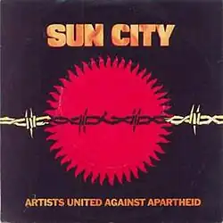 "Sun City" reached No. 38 on the Billboard Hot 100 chart in December 1985 (and #42 Cash Box).[8] Only about half of American radio stations played "Sun City". Some stations objected to the lyrics' explicit criticism of US President Ronald Reagan's policy of "constructive engagement", particularly George Clinton's and Joey Ramone's lines in the song "Our government tells us / We're doing all we can / Constructive engagement is / Ronald Reagan's plan." (Ramone also expressed open discontent and criticism towards him with the Ramones song "Bonzo Goes to Bitburg".)[9] "Sun City" was banned in apartheid South Africa itself.[10]
