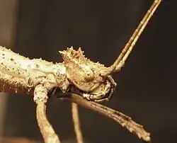 The females reach a length of 8.0 to 8.5 centimetres (3.1 to 3.3 in) and a weight of around five grams. At the end of the abdomen they have a beaked secondary ovipositor, typical of species of the Obriminae, which surrounds the primary ovipositor.[4] The nymphs and the freshly molted imago of the form known since 1995 are very light (beige). As they grow older, adult females become increasingly darker. What is striking is the crown of spines on the back of the head and the four flat spines on the meso- and metanotum. In light-colored females, these are often surrounded by a brown diamond pattern.[5]