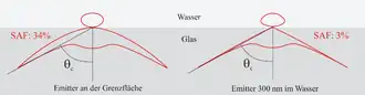 The principle how SAF Microscopy works is as follows: A fluorescent specimen does not emit fluorescence isotropically when it comes close to a surface, but approximately 70% of the fluorescence emitted is directed into the solid phase. Here, the main part enters the solid body above the critical angle.[1] When the emitter is located just 200 nm above the surface, fluorescent light entering the solid body above the critical angle is decreased dramatically. Hence, SAF Microscopy is ideally suited to discriminate between molecules and particles at or close to surfaces and all other specimen present in the bulk.[2][3]
