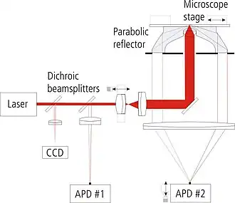 The typical SAF setup consists of a laser line (typically 450-633 nm), which is reflected into the aspheric lens by a dichroic mirror. The lens focuses the laser beam in the sample, causing the particles to fluoresce. The fluorescent light then passes through a parabolic lens before reaching a detector, typically a photomultiplier tube or avalanche photodiode detector. It is also possible to arrange SAF elements as arrays, and image the output onto a CCD, allowing the detection of multiple analytes.[4]