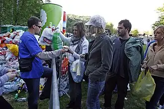 Supernatural Festival 2009. visitors recycling at the festival gates, since the entrance fee was three aluminum cans and plastic bottles recycled at the site.