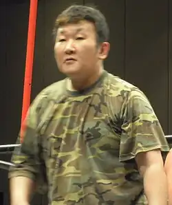 Tobita's most famous matches were against Mokujin Ken, also known as Ken The Box. Ken was a tree-like figure based on the character Mokujin from the Tekken video game series. Owing to Ken's super human strengths, all of their bouts were basically squashes with Ken easily winning in minutes via knockout.[2]