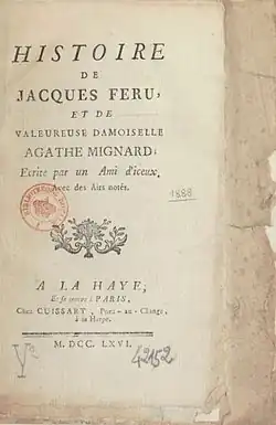 - ^ Histoires morales suivies d'une correspondance épistolaire entre deux dames, par Mademoiselle***, in Antoine-Alexandre Barbier, Dictionnaire des ouvrages anonymes et pseudonymes composés, traduits ou publiés en français, avec les noms des auteurs, traducteurs et éditeurs, accompagné de notes historiques et critiques, 2nd edition, tome II, Paris, 1823, n°8342, (p. 145)