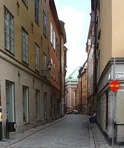 Svartmangatan (Swedish: (literally)) "Black Man Street") is a street in Gamla stan, the old town of Stockholm, Sweden. Stretching south-east from the central square Stortorget to Södra Benickebrinken and Norra Benickebrinken leading to the eastern main street Österlånggatan, it is intercepted by Kindstugatan, Tyska Skolgränd, Tyska Brunnsplan, Själagårdsgatan, Tyska Stallplan, and Baggensgatan, while forming a parallel street to Skomakargatan and Prästgatan. The name refers to the Blackfriar monastery once located at the southern end of the street.