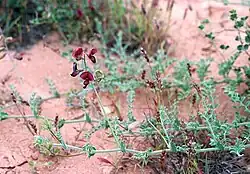 This species of pea grows in soakage areas in sandy or gravelly loam in scattered locations in the Avon Wheatbelt, Coolgardie, Great Victoria Desert, Murchison, Nullarbor and Yalgoo bioregions of inland Western Australia.[2][3]