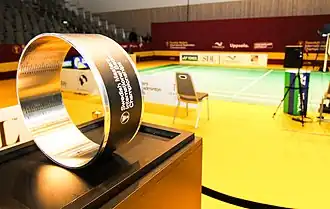 Swedish Masters International Badminton Championships or Swedish International Stockholm is an annual badminton tournament held in Sweden and hosted by Svenska Badmintonförbundet. It is part of the European Badminton Circuit. The tournament was started by Stockholms Badmintonförbund in 2004. Stockholms Badmintonförbund was running the tournament until 2008 and was handed over to Svenska Badmintonförbundet. The tournament was played in Sweden's capital Stockholm up until the 2013 edition. In 2014 the tournament moved to Uppsala,[1] about 1 hour north of Stockholm, and was run by former Swedish player Pär-Gunnar Jönsson. The 2016 edition represented the first BE International Challenge circuit tournament with the new increased prize money from US$15,000 to US$17,000, and will reach $25,000 by 2018. The Swedish Masters tournament also has one of the most unusual tournament trophies, in a circular shape representing the ring on the cork of the shuttle, with all the names of previous winners engraved on the inside.