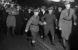 In 1933, SNSP underwent a major split.[14] A conflict between Furugård and Lindholm had simmered since 1932. The conflict emerged from a dispute between Lindholm (who had a somewhat more leftist approach) and the Göteborg party branch (in the hands of the more conservative elements). Furugård remained close to the Göteborg branch, and to some extent he became economically dependent on them. Gradually, tension grew between Furugård and Lindholm.[15] On January 13, 1933, Furugård expelled Lindholm and his followers from the party, after a chaotic meeting of the Great Council.[15][16] In response, Lindholm set up a party of his own, the National Socialist Workers Party (NSAP) on January 14, 1933.[15][16] Moreover, Lindholm sent out a declaration to the party branches accusing Furugård of corruption.[15] The SA leader, Hedengren, sided with Lindholm.[17] Many younger party members would also join Lindholm's party.[18] Following the split, SNSP was commonly nicknamed Furugårdspartiet ('The Furugård Party') or Furugårdarna to distinguish the party from Lindholmarna.[15][18]