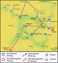 The Swedes were defeated, but succeeded under cover of night to cross the repaired bridge. Their losses amounted to 600 killed and wounded in the battle, compared to Brandenburg's 500.[27] The Swedes destroyed the bridge behind them, preventing Frederick's army from effectively pursuing.[26] The retreat continued through the Prignitz and Mecklenburg.[28] The Brandenburg cavalry caught up with the Swedish rearguard at Haberhof, but was repulsed. Another attempt was made near Wittstock, where the Brandenburg cavalry was once again thrown back with the loss of their major-general von Götze. After this, they called off the pursuit.[26] Many Swedish soldiers deserted during the hasty retreat.[29]