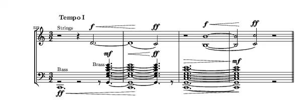 This section ends with a chord progression from A♭ back to the symphony's main key of C major taken directly from Sibelius's earlier work Valse triste from Kuolema.[15]