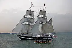 Royalist was built by Groves and Guttridge, East Cowes, Isle of Wight. She was designed by Colin Mudie RDI and launched on 3 August 1971 by Princess Anne.[3] In 1992, Royalist was taken out of the water for a refit, termed as a "Mid-Life Upgrade". Royalist was re-launched by Princess Anne, (now the Princess Royal). Built of steel, with an overall length of 29 metres (97 feet) (including the bowsprit, which adds about 6 metres to the overall length), the ship has a traditional square-rigged brig layout. Royalist took part in the Thames Diamond Jubilee Pageant in June 2012, and Brest International Festival of the Sea the following month. Royalist was decommissioned at Portsmouth in November 2014, pending arrival of a replacement of the same name in Spring 2015.[4]