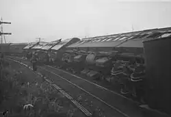 Railway engine and carriages on their sides on the track after being involved in a collision at Tamaree, October 1947
