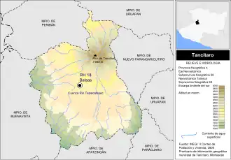 A volcanic peak, Pico de Tancítaro or Volcán Tancítaro, is located in the municipality. At 3,845 metres (12,615 ft) in elevation, it is the highest point in Michoacán state.