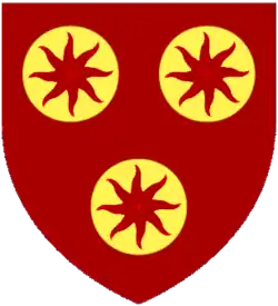 Gules three bezants each charged with an estoile of eight rays also Gules.