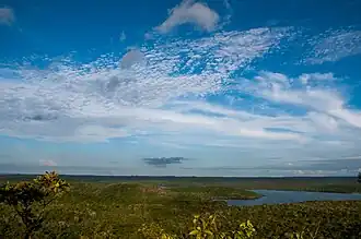 The unit is bounded by the Tapajós, the Cupari River, a tributary of the Tapajós, and the BR-163 Santarém–Cuiabá road. Part of the forest drains into the Tapajós to the west, and part drains into the Curuá Una River basin to the east. The Moju River, a tributary of the Curuá-Una, rises in the forest.[2] The side of the forest along the banks of the Tapajós has elevations of about 100 metres (330 ft) cut by ravines and deep valleys. The flat areas are periodically flooded in the rainy season. Further from the river the forest is on the Tapajós-Xingu plateau, with elevations of 120 to 170 metres (390 to 560 ft).[2]