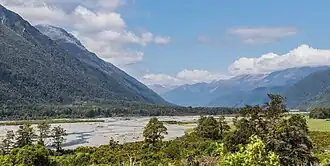The Taramakau River is a river of the West Coast Region of the South Island of New Zealand.[1] It rises in the Southern Alps / Kā Tiritiri o te Moana near Harper Pass, 80 kilometres (50 mi) due east of Hokitika, and runs westward for 75 kilometres (47 mi) into the Tasman Sea 15 kilometres (9.3 mi) south of Greymouth.[1][2]