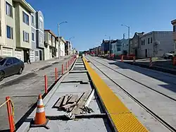 Construction on the first phase of the project, between 33rd Avenue and 46th Avenue, began in September 2019.[12] When Muni Metro service resumed on August 22, 2020, after a five-month closure during the COVID-19 pandemic, L Taraval service remained suspended west of Sunset Boulevard for construction.[2] Rail service was re-replaced with buses on August 25 due to issues with malfunctioning overhead wire splices and the need to quarantine control center staff after a COVID-19 case.[13] Construction of the eastbound platform began on December 10, 2020; construction of the westbound platform began on January 4, 2021.[14][15] The first phase of the project, including the platforms at 44th Avenue, was completed in July 2021.[12]