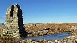A fence crosses the fell just east of the summit and this runs along the Sleddale Fells from Selside Pike in the north to Grey Crag and its satellite, Harrop Pike in the south. This boundary provides an aid to route finding in poor conditions. Another man made feature near to the summit is the remains of a surveying pillar. This unusual stone and concrete construction is cleft at the top to provide a sight line and was originally surrounded by a wooden frame, now decayed. This is one of four such pillars built during the construction of the Haweswater aqueduct. Below Branstree and Tarn Crag is the first section of the pipeline carrying water from the reservoir toward Manchester. The tunnel, some 1,300 ft (400 m) below the summit, required 250 tons of gelignite for blasting, and when constructed in the 1930s was the longest such pipeline in Britain. It emerges into Longsleddale below Great Howe, where the spoil can still be seen.[1]