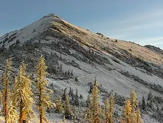 Most weather fronts originate in the Pacific Ocean, and travel northeast toward the Cascade Mountains. As fronts approach the North Cascades, they are forced upward by the peaks of the Cascade Range, causing them to drop their moisture in the form of rain or snowfall onto the Cascades (Orographic lift). As a result, the west side of the North Cascades experiences higher precipitation than the east side, especially during the winter months in the form of snowfall. During winter months, weather is usually cloudy, but, due to high pressure systems over the Pacific Ocean that intensify during summer months, there is often little or no cloud cover during the summer.[6] The months July through September offer the most favorable weather, and the Forest Service access road being open for the season. However, smoke from distant wildfires may potentially reduce visibility, and smoky summer conditions have been increasing with climate change.[7] In August 2015, the Tatie Peak Fire scorched over 140 acres near this mountain.[8]