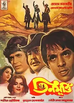 Teen Murti (in Bengali; transl.The Three Musketeers), also known as Jagir (in Hindi transl.The Estate),[1] is a 1984 Indian bilingual dacoit Western film simultaneously shot in Bengali and Hindi-languages, produced and directed by Pramod Chakravorty in his debut in Bengali cinema, under his banner of Pramod Films. The film stars an ensemble cast of Dharmendra, Mithun Chakraborty, Danny Denzongpa, Zeenat Aman, Shoma Anand, Pran, Amrish Puri and Ranjeet. The film plots three friends unfolding the truth of their past wrongs, which involves a hidden treasure and familial secrets.
