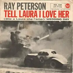 "Tell Laura I Love Her" is a teenage tragedy song written by Jeff Barry and Ben Raleigh. It was a US top ten popular music hit for singer Ray Peterson in 1960 on RCA Victor Records, reaching No. 7 on the Billboard Hot 100 chart.[1] Later that same year, it was recorded and released by Ricky Valance in the United Kingdom, where it went to the No. 1 spot on the UK Singles Chart.[2] The song has been a hit in 14 countries, and has sold over seven million copies.[3]