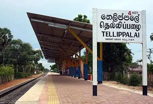 Tellippalai railway station (Tamil: தெல்லிப்பழை தொடருந்து நிலையம் Tellippaḻai toṭaruntu nilaiyam) is a railway station in the town of Tellippalai in northern Sri Lanka. Owned by Sri Lanka Railways, the state-owned railway operator, the station is part of the Northern Line which links the north with the capital Colombo. The station was not functioning between 1990 and 2015 due to the civil war. The Northern Line between Jaffna and Kankesanthurai was re-opened on 2 January 2015.[1][2]