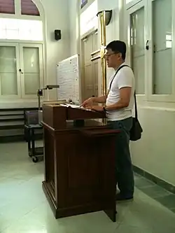 The pulpit used by Dr. John Sung, an evangelist from China, when he conducted revival meetings in the church in 1935.