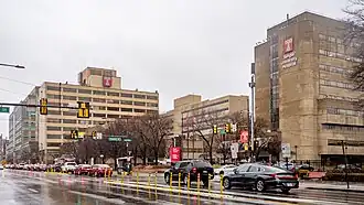 William Parkinson, who was appointed as the director of the hospital and Dean of School of Medicine in February 1929, oversaw its renovation and expansion to a 500-bed capacity by 1940.[7] Development progressed in 1950s with the leadership of William Parkinson as three new buildings were added to accommodate the increasing number of individuals served by the hospital. A new ancillary and outpatient building were added along with Parkinson Pavilion, which added 600 inpatient beds. Further development came in December 1982 when a replacement hospital was approved on Broad and Ontario to replace the main hospital building with a 504-bed facility. The new nine-story hospital opened in 1986 with an expanded emergency department, while the Parkinson Pavilion was renovated to an outpatient facility.[8]