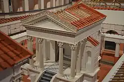 The Temple of Isis sits on a platform which is elevated off the ground, and entered in by way of stairs. The temple is designed based on a north-east and south-west plan.[14] It features a vaulted roof, drawing attention to the top of the building. This style of roofing was a Roman stylistic influence, yet was becoming phased out by the time the temple was built. Weber, who excavated the temple, speculated that the Temple of Isis was built according to the Corinthian order.[15] The Temple of Isis had two sections: an outer space surrounded by columns, called the pronaos; and the inner area - naos - which housed the statues of Isis and Osiris. Both areas of the temple were entered and exited through ornate niches.[14] The architecture of the Temple of Isis is a fusion of Greek, Roman, and Egyptian features, incorporating Egyptian statues in the design. The mixture of Eastern stylistic influences with Hellenistic paid tribute to Isis' Egyptian roots, while still keeping the imagery domestic. In comparison to authentic Egyptian temples, the Temple of Isis was very much in line with the Roman architectural style.[14] Egyptian features of this temple include: purgatorium, a roofless enclosure in the southeast corner of the courtyard that demarcates a subterranean room with a basin for Nile waters. The water from the Nile functioned as holy water used for rituals.[14] The structure itself resembles a miniature temple with pediments and pilasters at the entrance coated with stucco.[16] Structurally, it is built with columns all around; twenty-nine total.[8] Though it is not a large structure,[17] both the interior and exterior of the monument are elaborately decorated. Inside the inner chapel was a holding space for a statue of Isis. Further into the temple are altars and recesses in the walls; outside of the temple was a crypt used for initiating members into the cult.[8] It also features a large room - called an Ekklesiasterion - at the back of the sanctuary, which functioned as a gathering area for the members of the cult to participate in rituals.[18] Next to the Ekklesiasterion was the sacrarium, which stored the temple's prized objects.[14] Furthermore, statues of Isis are assumed to line the front of the temple with Roman deities along the long walls. The Temple of Isis was a significant aspect of life in Rome. It was in a central location near the Forum, theaters, wrestling school, and temples honoring gods, Asclepius and Neptune.[8] Upon analysis of the remains of the temple, it is known that it was painted with a red and white color scheme throughout. The white paint was meant to emulate a stone-like appearance.[14]