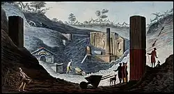The Temple of Isis sustained significant damage from the earthquake that affected Pompeii in the first century.[21] Although early excavators of Pompeii found nearly all of the Forum's buildings in disrepair or even in shambles, they discovered that Temple of Isis had been fully restored at some time between 62 CE and the eruption of Mount Vesuvius in 79 CE. The speed of this particular rebuilding is consistent with suggestions that Isis held an important role in Pompeiian daily life, both religiously and politically.[22][4] When the temple was excavated in 1764 by Karl Jakob Weber,[23] many remnants of temple life were found. Fragments of statues and ritual materials were found scattered in various parts of the temple.[24] The excavation in this area began in 1709 with Duc d'Elbeuf's unearthing of artifacts through well-digging in the area later identified as Herculaneum. The earliest excavations of the Roman towns in Campania - destroyed by the volcanic eruption of Mt. Vesuvius in 79 A.D. - are highlighted by the excavations between 1750 and 1764 and the work of Weber.[25] He was a Swiss military engineer charged with the supervision of the excavations during the period by Roceque Joaquin de Alcubierre, chief director of the royal excavations from 1738 until his death in 1780. These early excavations faced many daunting tasks: the difficulties of excavating through tons of volcanic material in Resina to investigate Herculaneum, the problems of disturbing established and arable farmland to evacuate in Pompeii, and the resulting health hazards from long periods underground in damp conditions. During the extraction of this material, Weber's workers dug haphazardly around the site looking for valuable sculptural finds, back-filling immediately afterwards to prevent collapse. Although Weber, determined to produce accurate maps of the orientation of the villages and individual buildings, believed the newly discovered areas should be left exposed for public exhibition.[25]