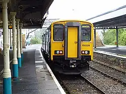 The station is unstaffed but has a ticket machine. There is a shelter on the eastbound platform in addition to the canopies on each side. Train running information is available via digital display screens, a help point on platform 2, timetable posters and by telephone. There is a payphone in the station car park. The platforms are linked by footbridge, but wheelchair and mobility impaired users may reach the eastbound platform by means of a barrow crossing (with assistance). Level access is available from the car park to the westbound platform.[11] In February 2025, it was reported that plans had been submitted to install an accessible footbridge as the station it is not compliant with the Equality Act 2010.[12]