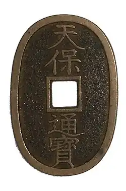 The Tenpō Tsūhō (Japanese: 天保通宝; kyūjitai: 天保通寳 or 天保通寶) was an Edo period coin with a face value of 100 mon, originally cast in the 6th year of the Tenpō era (1835).[4][5] The obverse of the coin reads "Tenpō" (天保) a reference to the era this coin was designed in, and "Tsūhō" (通寳) which means "circulating treasure" or currency.[6] The Kaō is that of Gotō San'emon,[7] a member of the Kinza mint's Gotō family (後藤家), descendants of Gotō Shozaburo Mitsutsugu, a metalworker and engraver from Kyoto appointed by shōgun Tokugawa Ieyasu in 1600 to oversee the Edo mint of his shogunate and oversee its coinage.[8][9][10] All mother coins were produced in Edo (present day Tokyo) before they were sent to other mints where they would place the individual mint's mark (shirushi, 印) on the edge of the coin. The coin circulated for 40 years, and stopped being produced during the Meiji Restoration after the introduction of the Japanese yen. Today these coins are now sold as "lucky charms" as well as being collected by numismatists.