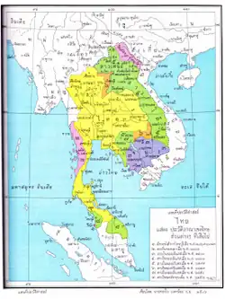 In 1963, another version of the set was included in a student atlas illustrated by Thongbai Taengnoi, a school headteacher from Prachin Buri. Thongbai's atlas, also published by Thai Watana Panich, became an extremely popular textbook and was widely used by schools all over the country into the 21st century, with its 44th printing in 2014.[6] Most Thai people have since become acquainted with the maps through its use in Thongbai's atlas.[3][7]