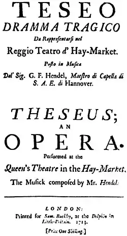 Teseo ("Theseus", HWV 9; Italian pronunciation: [teˈzɛo]) is an opera seria with music by George Frideric Handel, the only Handel opera that is in five acts.[1] The Italian-language libretto was by Nicola Francesco Haym, after Philippe Quinault's Thésée. It was Handel's third London opera, intended to follow the success of Rinaldo after the unpopular Il pastor fido.