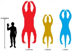 Size diagram comparing a human, T. yuacensis (red), T. littoralis (yellow), and T. natans (blue)