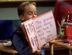 ![]() Michael presenting a page of "The Angry Family" in class | |