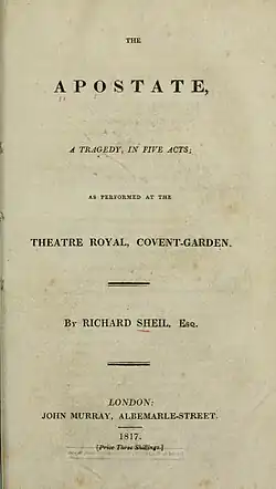 The Apostate is an 1817 tragedy by the Irish writer Richard Lalor Sheil.[1] It premiered at the Theatre Royal, Covent Garden on 3 May 1817.[2] The original cast included William Macready as Pescara, Charles Kemble as Hemeya, Charles Mayne Young as Malec, Thomas Comer as Hamy, Charles Murray as Alvarez, Daniel Egerton as Gomez and Elizabeth O'Neill as Florinda. The prologue was spoken by Charles Connor. It was loosely inspired by a 17th century work by the Spanish playwright Pedro Calderón de la Barca. The play was a success, but reviewers generally attributed this to O'Neill's acting rather than Sheil's writing.[3]