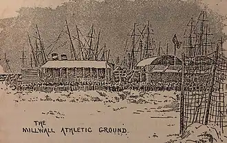 The Athletic Grounds[1][2] was a football ground and the home of Millwall Athletic Football Club from 1890–1901, the team who went on to become Millwall. It was situated on the Isle of Dogs, East London. It was the third stadium Millwall had occupied since their formation as a football club in 1885.[2][3] Millwall were formidable at the Athletic Grounds, winning 73% of their games.[4] In total they played 147 games here in all competitions, winning 108, losing 24 and drawing 15.[4]