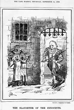 The Cape Hornet ran only from 5 June until 29 November 1879, just under 6 months in total. It was edited by William T. Eady and illustrated by the cartoonist Charles Barber, who had previously worked for the other major Port Elizabeth publication at the time, the Observer. The illustrations covered public events and political satire. The Hornet was a prominent supporter of the attempt by Carnarvon to enforce a British confederation on southern Africa.[1][2]