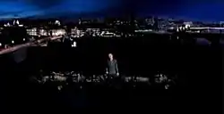 The music video for "The Climb" premiered on Cyrus' Myspace page on February 11, 2009.[51] The video commences with a shot of Cyrus holding a guitar and a suitcase as she begins to walk down a long path extending through a valley. At the end of the valley, the sun breaks out over a distant mountain. The entire scene is enhanced with computer-generated imagery.[52] Cyrus has her hair tied in a bun and wears a traveling jacket, a gray tank top, and cowboy boots. In a separate setting, Cyrus, wearing a gray short-sleeved shirt and her hair loose, begins to sing "The Climb" beneath a blue spotlight in a purple room. The two settings alternate throughout the video. A vignetted scene from Hannah Montana: The Movie appears in front of Cyrus as she walks on the path. The video zooms into the scene and a montage of film clips plays, featuring Cyrus's character and her love interest, Travis Brody (played by Lucas Till) horseback riding. The video returns to Cyrus walking; she picks up a rose fallen on the path, then throws it behind her. As the video progresses, she also sees things such as a herd of horses and a shooting star cross her path.[16] A new setting enters the video in which Cyrus dances in a purple room with a countdown, or occasionally, film clips projected on the wall behind her. Rain begins to pour in the path setting. Cyrus puts down her jacket, guitar case, suitcase, and boots, and continues onwards with only her guitar strapped to her shoulder. More film clip montages play in the same manner as the first. As the last montage ends, Cyrus finally reaches the summit of a reddish, CGI mountain and triumphantly looks over the cliff's edge to watch the sun shining over a shimmering lake.[52] An alternate version of the music video excluding the Hannah Montana: The Movie clips exists and was sent to several channels, including VH1.[53]