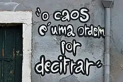Graffiti with quote from The Double: O caos é uma ordem por decifrar ("Chaos is order yet undeciphered.")
