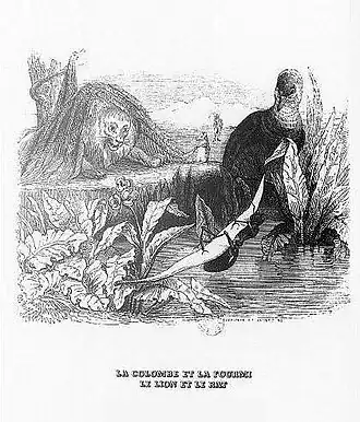 There has been little variation in the fable since it was first recorded in Greek sources. An ant falls into a stream and a dove comes to the rescue by holding out a blade of grass to allow it to climb out. Then, noticing that a fowler was about to catch the dove, the ant bit his foot and his sudden movement caused the bird to fly away. In the Renaissance the Neo-Latin poets Hieronymus Osius[2] and Pantaleon Candidus[3] included it in their fable collections. In England it appeared early in William Caxton's collection of Aesop's fables[4] and was later included in those of Francis Barlow[5] and Samuel Croxall.[6] It also appeared in Thomas Bewick's Select Fables, but was there told of a bee rather than an ant.[7]